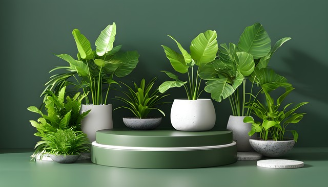 绿色背景前的植物装饰,包含多种叶子与石头,呈现生动的自然场景。
