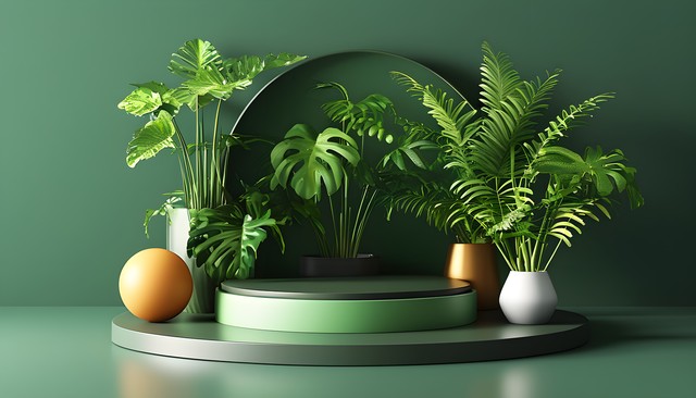 绿色背景前的植物装饰,包含多种叶子与石头,呈现生动的自然场景。