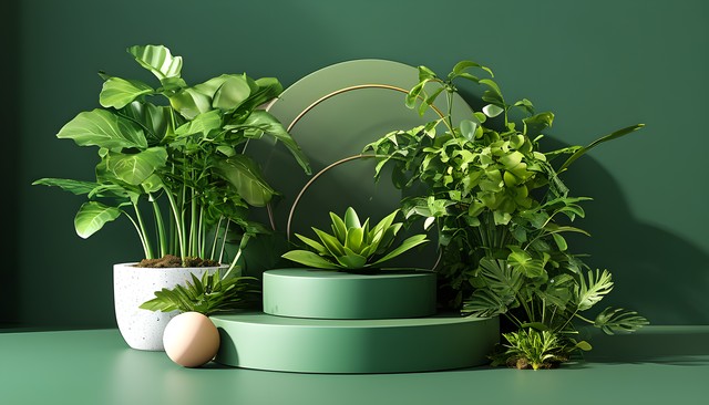 绿色背景前的植物装饰,包含多种叶子与石头,呈现生动的自然场景。