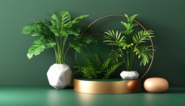 绿色背景前的植物装饰,包含多种叶子与石头,呈现生动的自然场景。