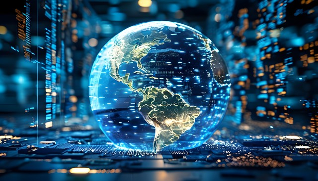 一个逼真的数字地球与数据流动结合的科技感图像,展现了现代技术的魅力。