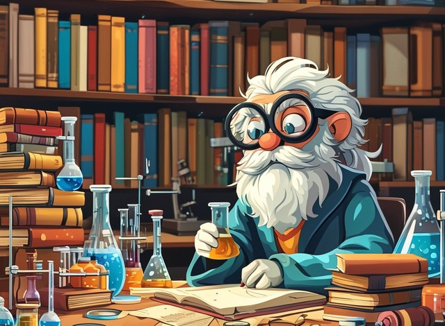 卡通盲盒风格的学者在实验室中专注研究,周围堆满书籍和仪器。