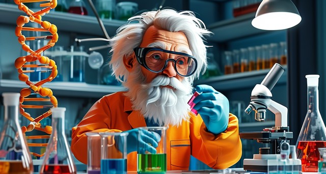 卡通盲盒风格的基因工程科学家正在实验室中操作基因序列,创造未来生物。