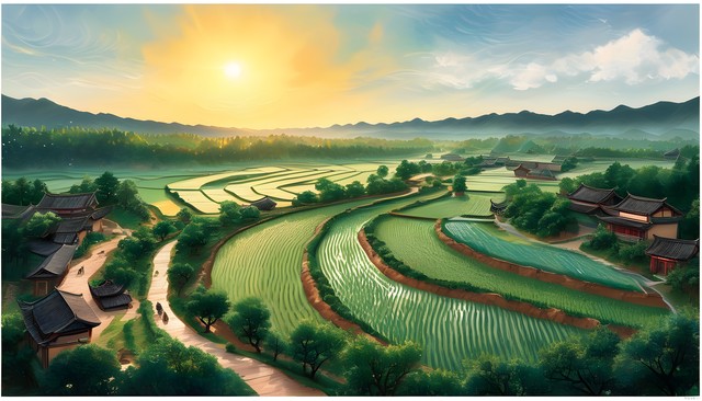 美丽的田园风光,阳光洒在波浪起伏的稻田上,山脉与村庄交错,和谐自然。