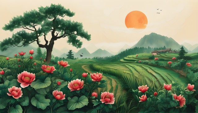 美丽的田园风光,阳光洒在波浪起伏的稻田上,山脉与村庄交错,和谐自然。
