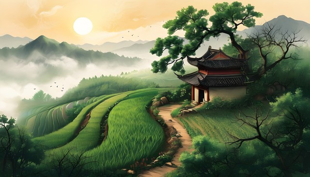 美丽的田园风光,阳光洒在波浪起伏的稻田上,山脉与村庄交错,和谐自然。