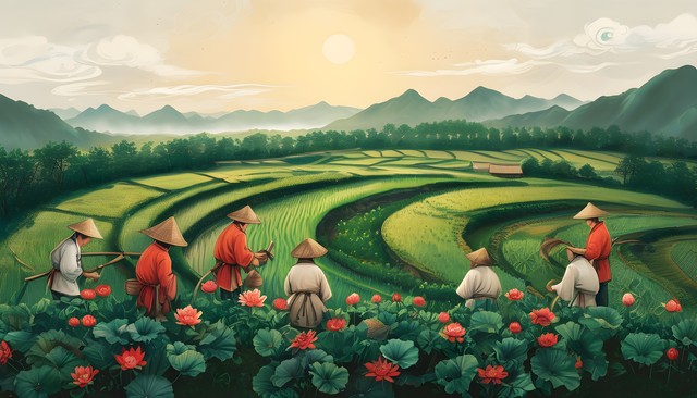 美丽的田园风光,阳光洒在波浪起伏的稻田上,山脉与村庄交错,和谐自然。