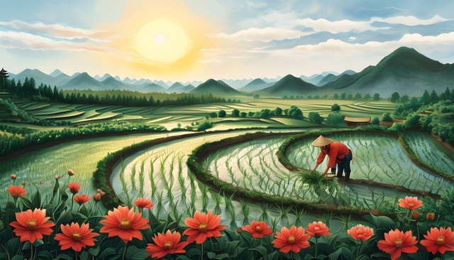美丽的田园风光,阳光洒在波浪起伏的稻田上,山脉与村庄交错,和谐自然。