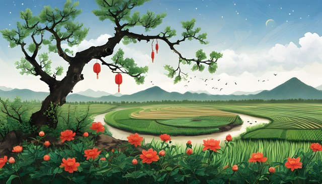 美丽的田园风光,阳光洒在波浪起伏的稻田上,山脉与村庄交错,和谐自然。