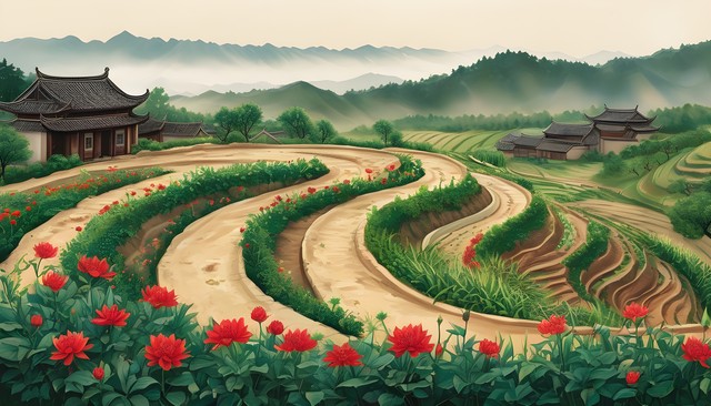 美丽的田园风光,阳光洒在波浪起伏的稻田上,山脉与村庄交错,和谐自然。