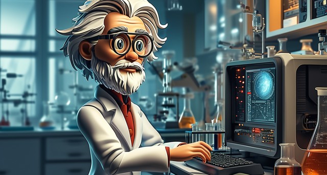 一个卡通盲盒风格的科学家,站在实验室里操作复杂的计算机设备。