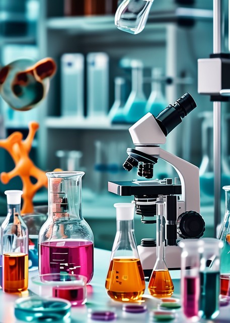 在卡通盲盒风格的生物医药研究实验室中,一位科学家正在观察显微镜下的奇妙微观世界。