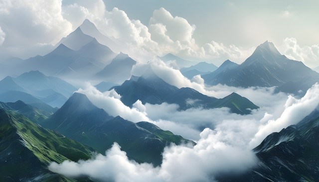 色彩斑斓的山脉,云朵缭绕,展现自然的壮丽景色。