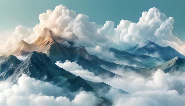 色彩斑斓的山脉,云朵缭绕,展现自然的壮丽景色。
