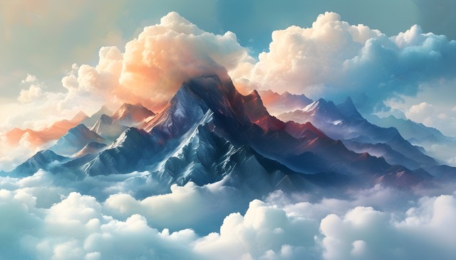 色彩斑斓的山脉,云朵缭绕,展现自然的壮丽景色。