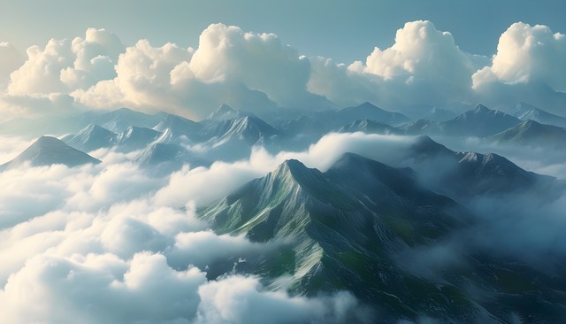 色彩斑斓的山脉,云朵缭绕,展现自然的壮丽景色。