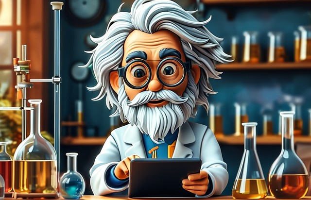 卡通盲盒风格的科学家,专注使用高科技平板电脑进行研究