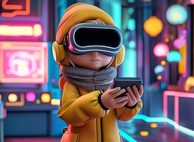 卡通盲盒风格的增强现实技术场景,人物手持设备沉浸于数字世界的奇妙体验。