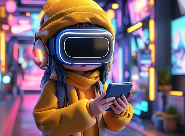 卡通盲盒风格的增强现实技术场景,人物手持设备沉浸于数字世界的奇妙体验。