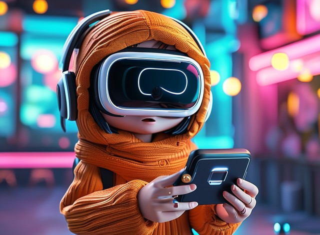 卡通盲盒风格的增强现实技术场景,人物手持设备沉浸于数字世界的奇妙体验。