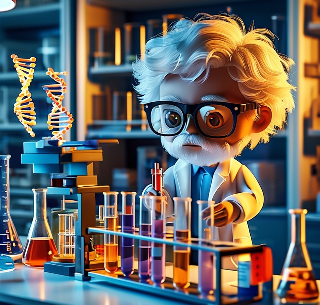 一个卡通盲盒风格的实验室,里面有一个科学家在操作基因编辑工具,周围的实验台上摆满了试管和DNA模型。