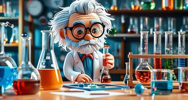 卡通盲盒风格的科学家在实验室中忙碌,桌面上摆满了试管和烧瓶。