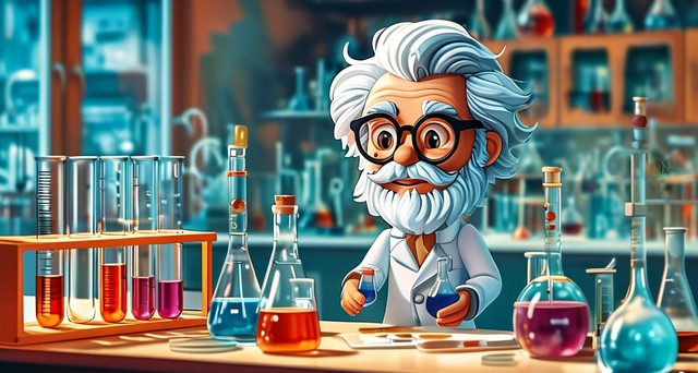 卡通盲盒风格的科学家在实验室中忙碌,桌面上摆满了试管和烧瓶。