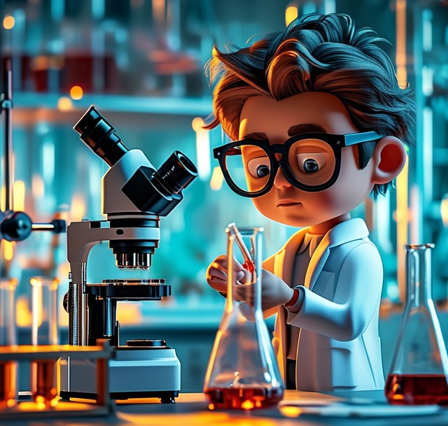 在充满试管和显微镜的实验室中,一位卡通盲盒风格的科学家正专注地操作着基因编辑器。