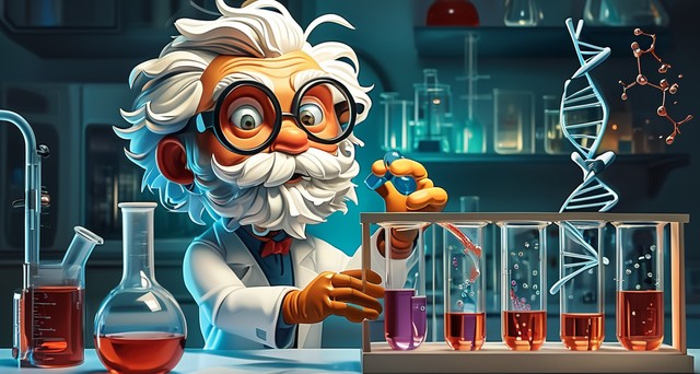 一幅卡通盲盒风格的插画,展示科学家在实验室中操作基因序列,夸张的表情和搞笑的动作增添趣味性。