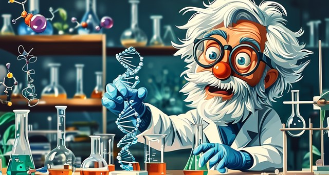 一幅卡通盲盒风格的插画,展示科学家在实验室中操作基因序列,夸张的表情和搞笑的动作增添趣味性。