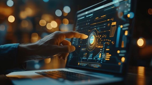 手指指着笔记本电脑屏幕上的图形在现代商业环境中