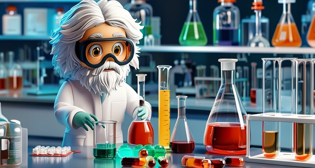 一个卡通盲盒风格的实验室,科学家在研究新药。