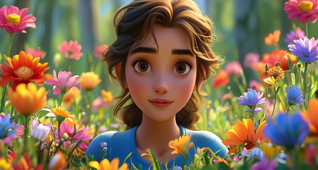 一位皮克斯风格的动画女孩,健康地做瑜伽,周围环绕着五彩斑斓的花朵和清新的自然元素。