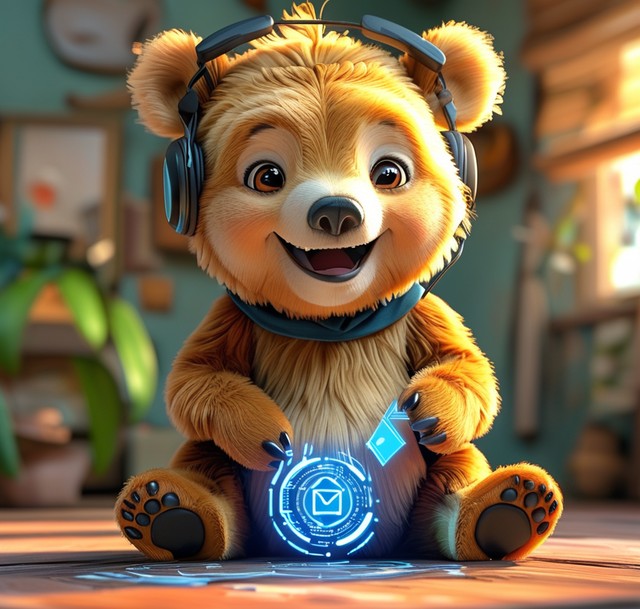 卡通盲盒风格的可爱小熊在数字世界里操作区块链技术,微笑交互。