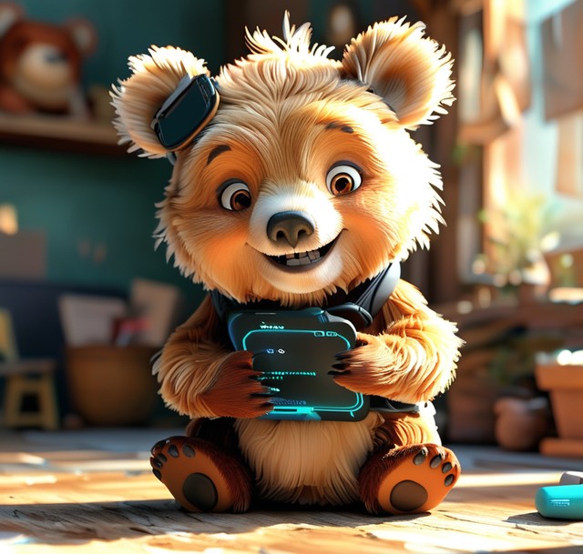 卡通盲盒风格的可爱小熊在数字世界里操作区块链技术,微笑交互。