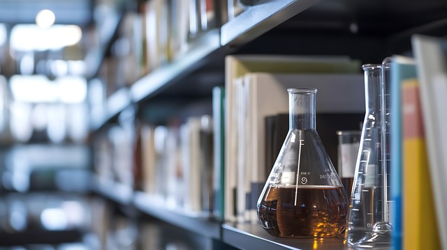实验室壁架上整齐排列的研究文献与书籍,反映科学家的努力和成就。