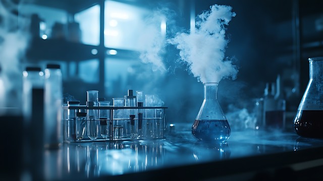实验室内,化学反应产生的烟雾弥漫,营造出神秘而科学的氛围。