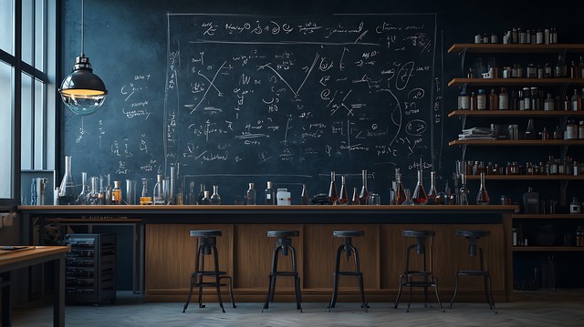 实验室墙上的黑板上画着复杂的化学方程和公式,显示科学研究的深度。