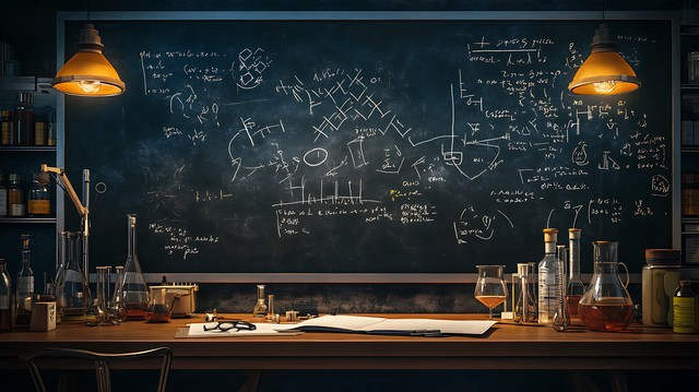 实验室墙上的黑板上画着复杂的化学方程和公式,显示科学研究的深度。