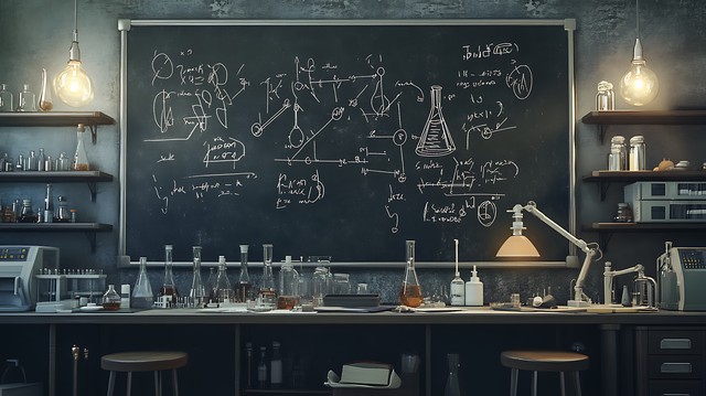 实验室墙上的黑板上画着复杂的化学方程和公式,显示科学研究的深度。