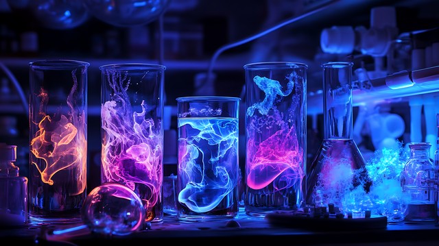 实验室内的紫外线灯照射下,荧光标本闪烁,营造出奇幻的光影效果。