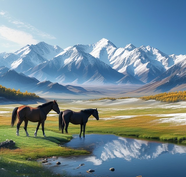 【AIGC】新疆阿勒泰自然风景,山和草原上的马