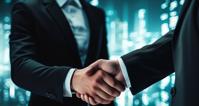 近距离关注商务男士握手,科技感的背景