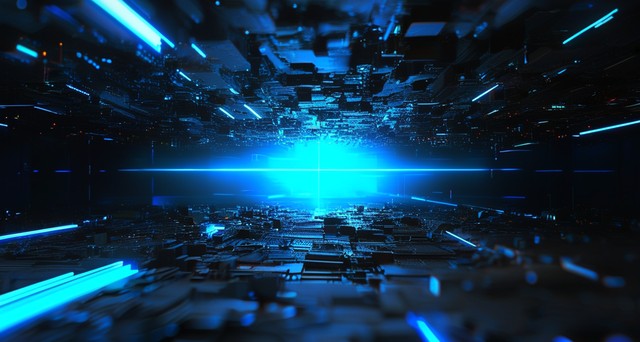 抽象技术黑色背景。 未来数字主板纹理。 霓虹蓝光