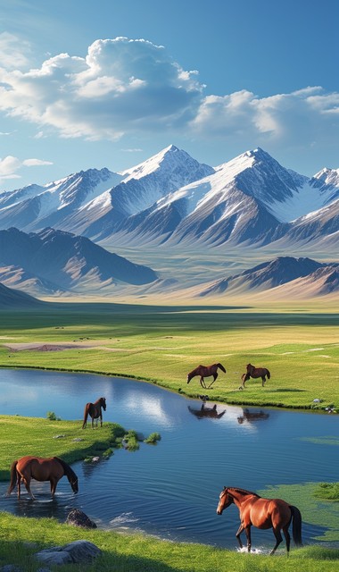 【AIGC】新疆阿勒泰自然风景,山和草原上的马