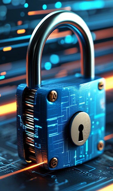安全概念数字网络安全上的闭合挂锁蓝色抽象高速互联网技术背景插图。 钥匙。