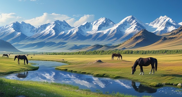 【AIGC】新疆阿勒泰自然风景,山和草原上的马