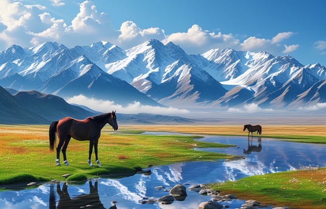 【AIGC】新疆阿勒泰自然风景,山和草原上的马