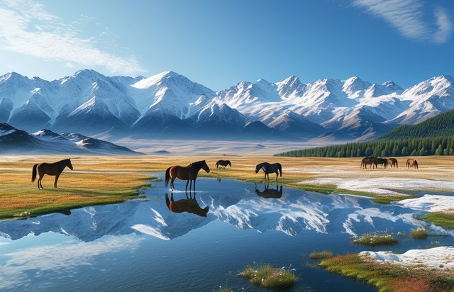 【AIGC】新疆阿勒泰自然风景,山和草原上的马