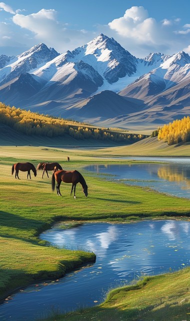【AIGC】新疆阿勒泰自然风景,山和草原上的马